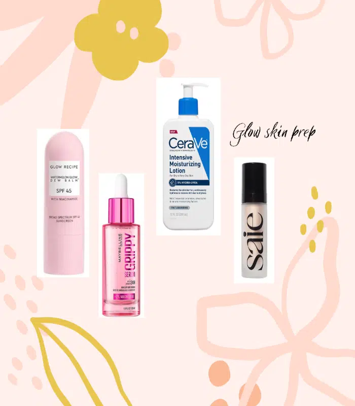 Một số sản phẩm được khuyên dùng cho bước chuẩn bị da bao gồm: Kem chống nắng Glow Recipe Watermelon Glow Niacinamide Dew Balm Face Sunscreen Stick SPF 45 với giá 30 đô la, serum primer Maybelline Grippy Serum Hydrating Grip Primer Makeup với giá 12,99 đô la, kem dưỡng ẩm CeraVe Daily Moisturizing Face and Body Lotion for Balanced to Dry Skin với giá 15,99 đô la và chất tạo glow Saie Glowy Super Gel Multipurpose Illuminator với giá 29 đô la.