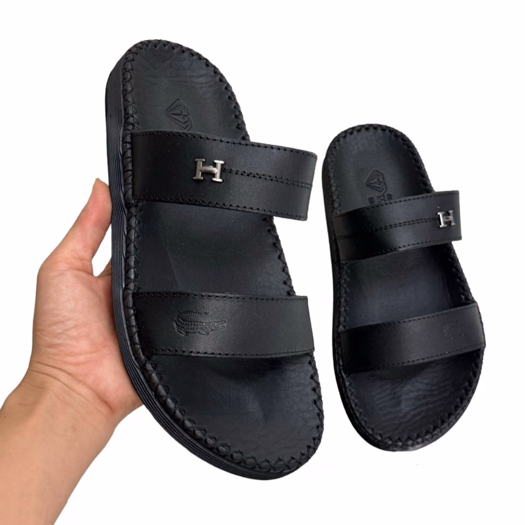 🔥 Dép nam thời trang H76 quai ngang da bò cao cấp màu đen thanh lịch đế khâu chắc chắn,giá tốt đang giảm giá!