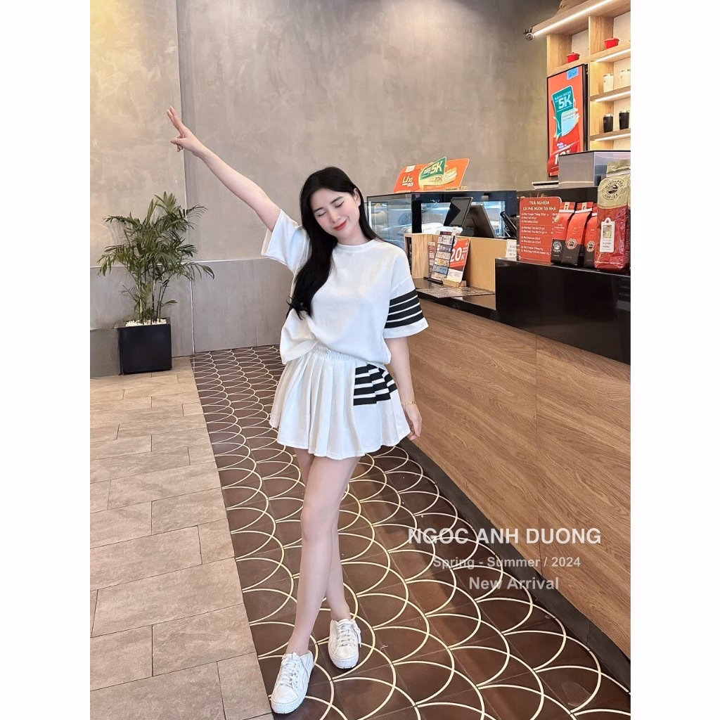 Set Váy Nữ Áo Phông Ngắn Tay Thome Kẻ Tay 3 Vạch Mix Chân Váy Xếp Ly Dáng Ngắn Siêu Xinh Freesize Hot 2024